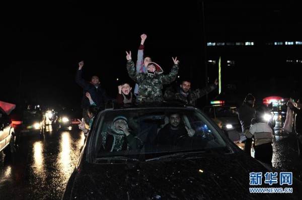 12月22日,在叙利亚北部城市阿勒颇,民众上街庆祝叙政府军收复该市。叙利亚军方当晚发表声明,宣布北部城市阿勒颇内剩余的反政府武装人员已全部撤出,叙政府军完全收复阿勒颇市。新华社发(阿马尔摄)