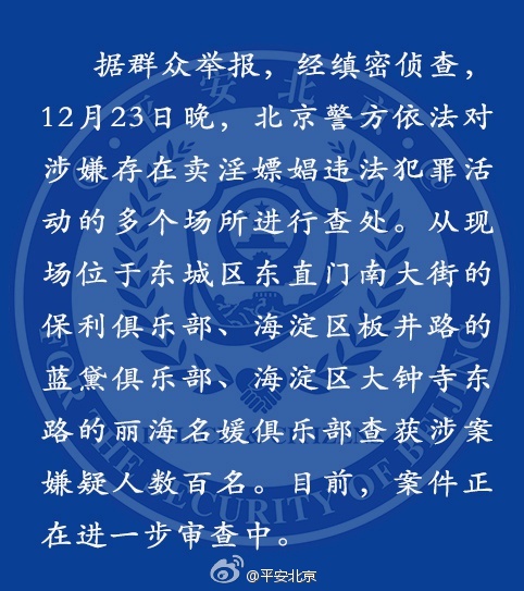 人民网北京12月25日电 据北京市公安局官方微博通报,12月23日晚,北京警方依法对涉嫌存在卖淫嫖娼违法犯罪活动的多个场所进行查处,查获涉案嫌疑人数百人。