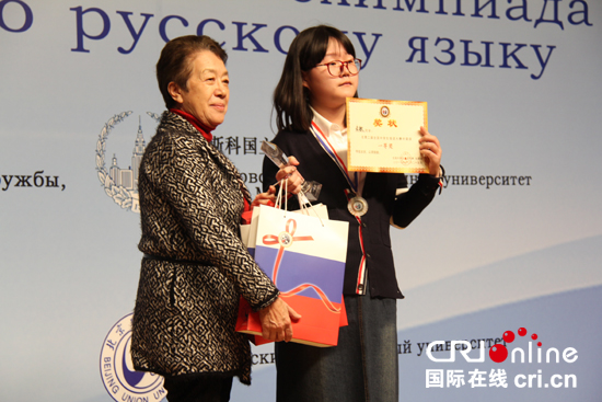 第二届全国中学生俄语大赛评委会主席李英男为本届大赛一等奖获得者金敏颁奖 拍摄:郝志慧