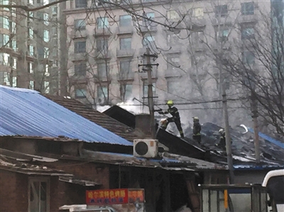 下午6时许,现场勘查工作仍在进行。站在警戒线外可以看到,事发平房的房顶已经烧黑,露出框架。据现场的一名消防人员称,起火原因系煤气罐爆炸。