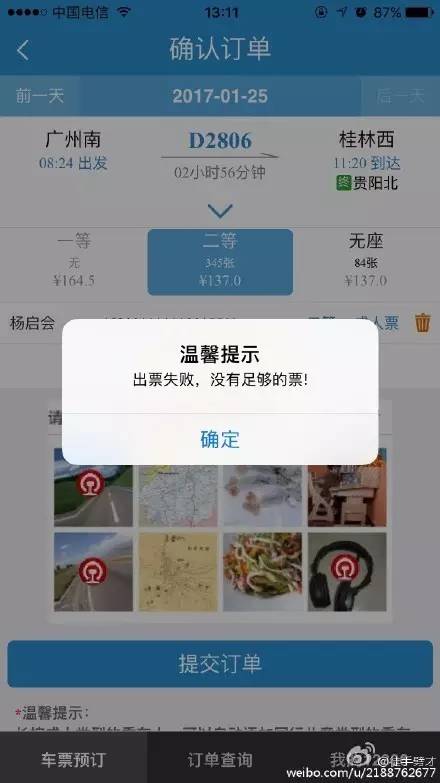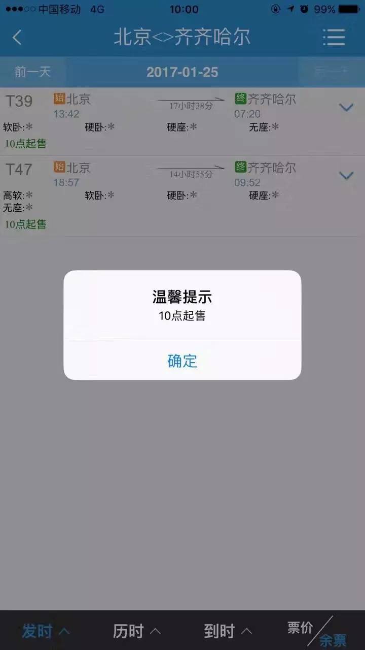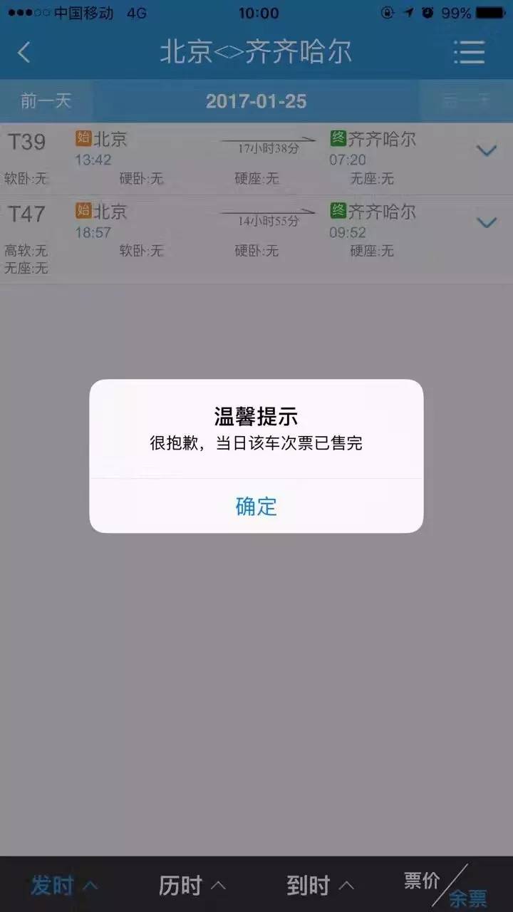 今天上午,朋友圈里就有朋友吐槽火车票如何难买,当把照片点开仔细一看,才发现北京到齐齐哈尔的两趟车,所有车票竟然在一分钟之内全部被秒杀。(请注意截图时间↓↓↓)