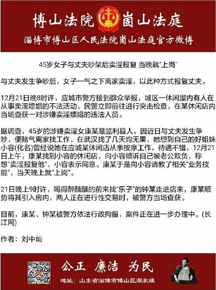 6.【女子与丈夫吵架后卖淫报复,当晚就上岗】45岁的湖北女子康某与丈夫发生争吵后,赌气离家找工作。她想到好姐妹小容在某休闲店从事按摩工作,待遇不错。康某找到小容,倾诉自己被老公欺负,称想“卖淫报复他”,小容表示同意。康某于是向小容请教了相关业务技能,当天晚上就上岗了。