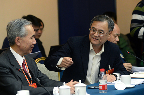 2015两会期间,钱颖一委员在小组讨论会上发言 。视觉中国 资料