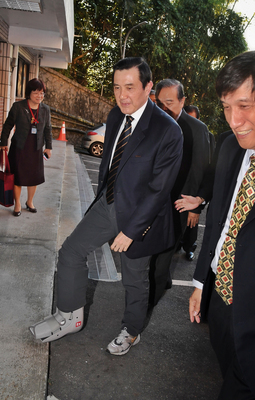 前台湾地区领导人马英九(中)日前慢跑时不慎扭伤脚踝,伤势未愈,4日脚上仍戴着护具前往铭传大学专题演讲。图片来源:台“中央社”