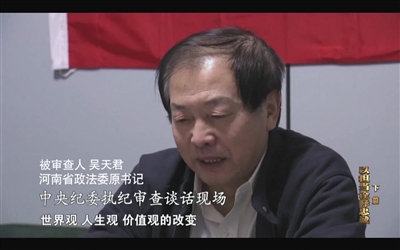 去年11月11日,河南省委原常委、政法委原书记吴天君因涉嫌严重违纪,被调查。昨晚的专题片,播出了办案人员对吴天君的执纪审查谈话现场。