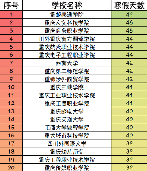 根据市教委公布的2016-2017年度重庆高校寒假放假时间表,重邮移通学院放假时间为1月7日,开学时间为2月25日,寒假天数为49天;紧随其后的是重庆人文科技学院和重庆商务职业学院,分别有46天和45天。