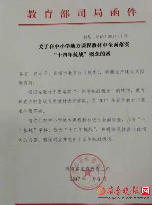 原标题:山东省教育厅接到教育部司局函件 教材修改要求将8年抗战一律改为14年抗战
