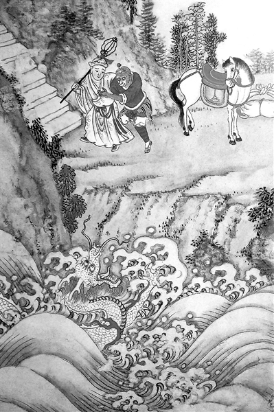也有不少读者研究取经故事的源流,热衷于探讨孙悟空、猪八戒、沙和尚的原型,以及谁最先加入了取经的队伍。其中,孙悟空的原型猴行者、沙和尚可以追溯到远早于《西游记杂剧》的《大唐三藏取经诗话》。其实,白龙马的原型也在其中出现了,只不过不甚明显罢了。《诗话》第七章载九龙池有九条馗头鼍龙,“常会作孽,损人性命”,最后“被猴行者骑定馗龙,要抽背脊筋一条,与我法师结条子”。又说: