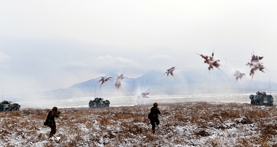 陆军某部“大功三连”进行进攻战斗协同演练。王东辉/摄