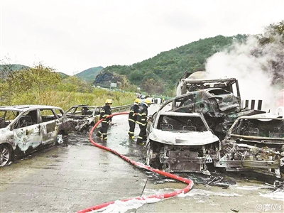 1月14日,进入春运的第二天,广东清连高速清远至阳山方向阳山湟池路段发生一起多车连环相撞的交通事故。目击者告诉北京青年报记者,事故发生在上午9时许,“从反方向经过的时候,看到前面的槽罐车和小汽车着了火,槽罐车车头位置几乎被烧得只剩框架,几辆小汽车车身都是火焰。”
