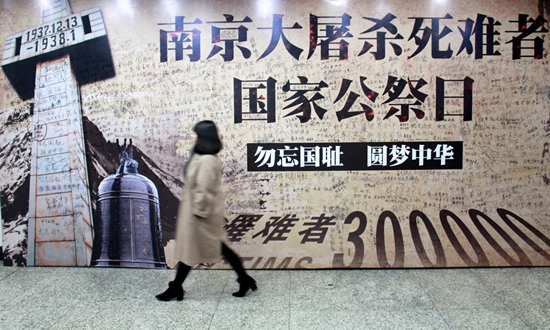 2016年12月12日,南京,市民从地铁站的“国家公祭日和平许愿墙”边经过。 视觉中国供图