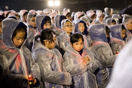 2016年12月13日晚7时,来自德国、加拿大、韩国、日本等国的国际友好人士约150人,200名青少年学生,中日两国僧侣代表以及南京大屠杀幸存者、抗战老兵等在侵华日军南京大屠杀遇难同胞纪念馆祭奠广场内,手托红烛、低头默哀,为南京大屠杀死难者举行守灵暨烛光祭活动。 视觉中国供图