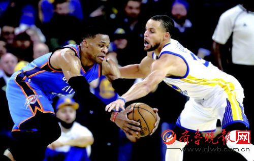 威少(左)与库里在球场上争抢。 新华社发