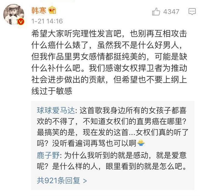5.【《乘风破浪》歌曲惹争议韩寒:不要上纲上线】韩寒20日发布《乘风破浪》主题曲《男子汉宣言》,但歌词被网友吐槽直男癌。今日韩寒再发双生主题曲《男子汉誓言》。韩寒解释,两首歌不是什么反转,改编自日文歌《关白宣言》、《关白失脚》,描写的都是自卑笨拙但努力的男人的爱。针对负评,韩寒表示“虽然我不是什么好男人,但我作品里男女感情都挺纯美的,可能是缺什么补什么吧。”他还呼吁大家可以听完理性发言,不要上纲上线。”