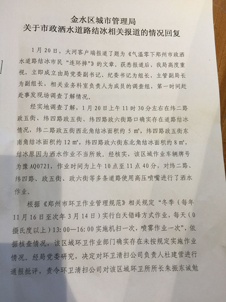 10.【郑州市政洒水结冰致市民摔倒,官方致歉并处理多人】郑州市市政洒水致金水区纬四路政六街等街道结冰,造成市民摔倒。1月21日,金水区城市管理局表示,对环卫清扫公司负责人杜建营进行通报批评,对该区域机械化作业队队长李峰立予以免职,对作业司机魏坤予以辞退。