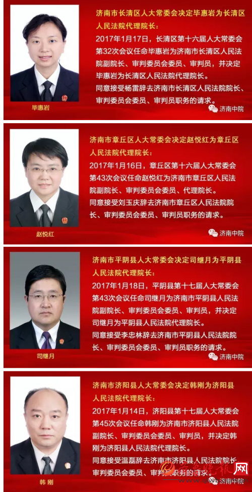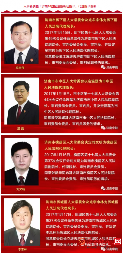 齐鲁晚报讯(记者 宋立山)1月22日,济南中院官方微信发布了一则人事调整消息,济南10县区法院新任院长、代理院长履新。