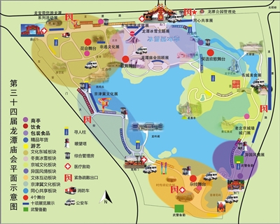 举办民间花会、笑语欢歌、杂技、曲艺四大舞台演出80余场;开设龙宝带您游龙潭、庙会随手拍、进门好运、棋类等四项互动活动;举办龙宝带您游龙潭系列活动展、龙潭冰雪主题展、异国风情展和非遗文化展等十项展览展示。