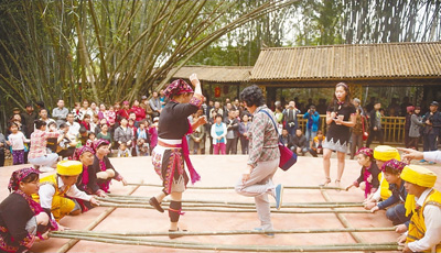 海南琼海会山镇,游客与苗寨姑娘同跳竹竿舞。