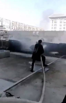 说完,田彬便从保安手里拿过灭火器,和几个保安一起冲向楼顶前去灭火。由于灭火器效果不太好,一罐灭火器没过多久就用完了,随后改为使用水枪。田彬和几个保安灭火持续了4-5分钟,火势仍然在燃烧,不过这时消防队已经及时赶到。