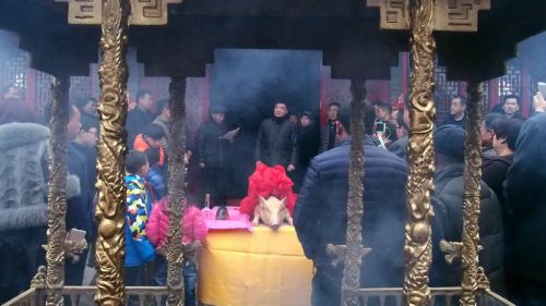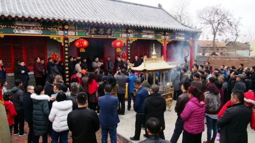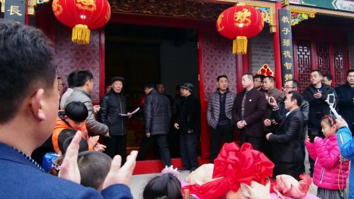 1月28日,大年初一中午,即墨市蓝村镇王演庄北村,毛氏家族在刚刚修整完毕的毛氏宗祠内举行 隆重的祭祖仪式。全省各地毛家后人闻讯纷纷赶来认亲。