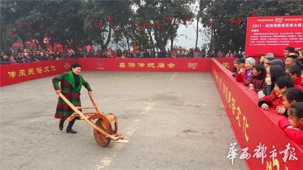作为庙会最具特色的民俗活动“推鸡公车”、“估膘”现场,更是热闹非凡,呐喊声此起彼伏。但见一根高竹竿上飘扬着“估膘”二字的旗标处,围着一大圈人,不问便知,那是在玩估膘游戏。走近一看,刚好估票发了下去,参赛者正在揣测着肉的重量。“可能有三斤多哦。”“不见的哦,这块肉看起来肥肉多精肉少啊。”人群里,大家七嘴八舌地议论着。这边的讨论还没有着落,那边“财神送福”又吸引了不少年轻人、小孩子的参与……玩游戏节目、看民俗表演、品传统小吃……春节的纯阳观,人潮涌动,灯笼高挂,热闹非凡。
