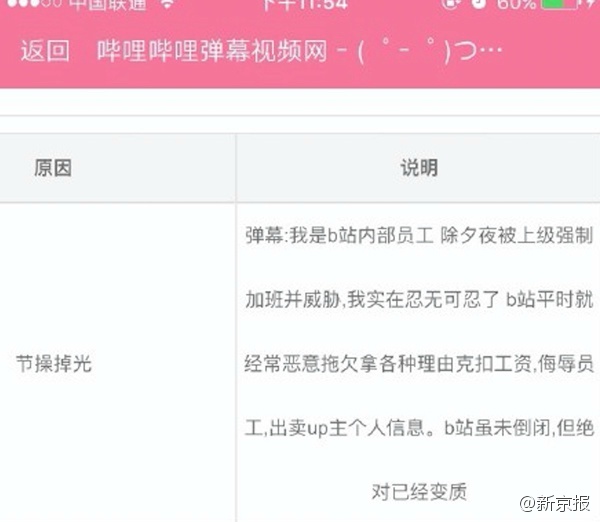 10. 【B站除夕夜遭攻击:部分账号“节操值”掉光称已报案】昨日B站部分网友发现自己因掉光“节操值”被“禁言” ,而自己根本没有任何违规操作,被扣说明写着:“我是B站内部员工,除夕夜被上级强制加班并威胁,B站经常恶意拖欠拿各种理由克扣工资。”B站称,受到外部攻击,已报警。