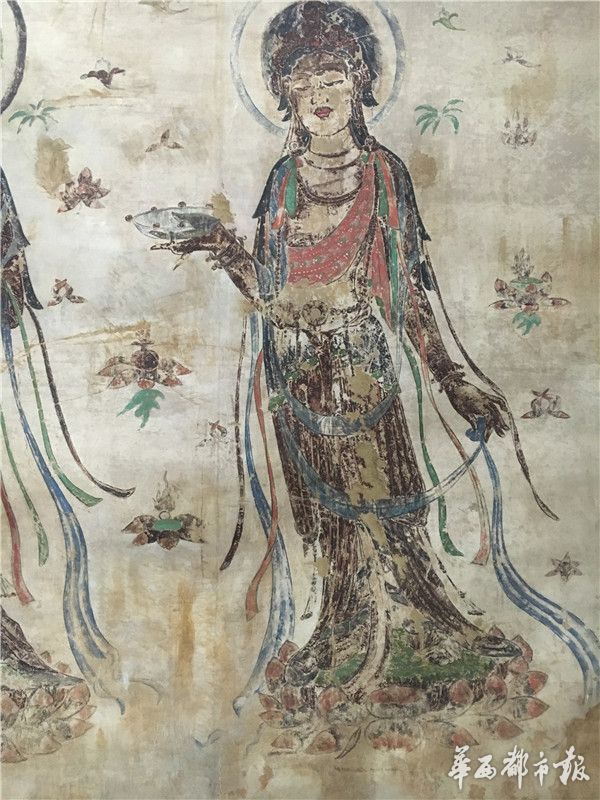 例如莫高窟第401窟壁画《供养菩萨二身》,绘于初唐时期,临摹品现藏于成博4楼展区。壁画中绘有二身供养菩萨,他们身材修长,身姿曼妙,头戴宝冠,斜披天衣,脚踩莲花,巾带飞扬,身周天花飞舞。值得注意的是,左侧一身双手执莲花,右侧这身右手托玻璃盏。虽然原画斑驳陆离,菩萨面容失色,但晶莹剔透的琉璃盏清晰可辨,十分逼真。