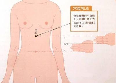 中脘穴位于身体的中心线上,距离肚脐上方约4寸(六指横宽)的位置。
