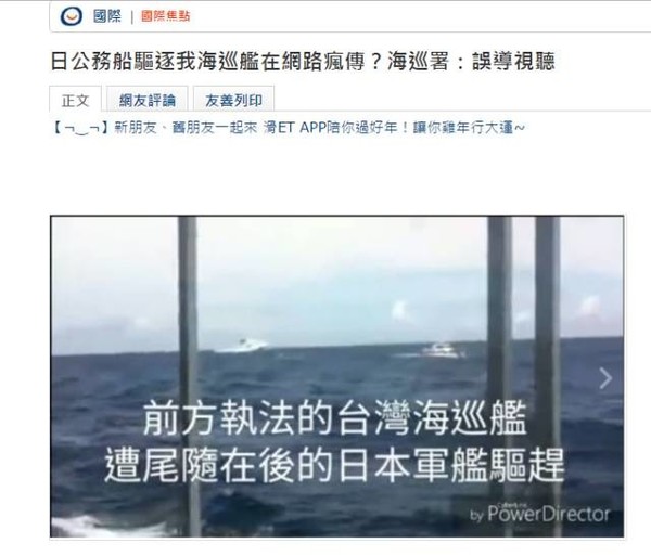 2月3日台湾“东森新闻云”报道称,最近在几个脸谱(Facebook)粉丝团上,有网友分享了一段视频,内容是台湾的海巡舰,遭到日本军舰驱赶,而且,地点就在台湾所属海域。