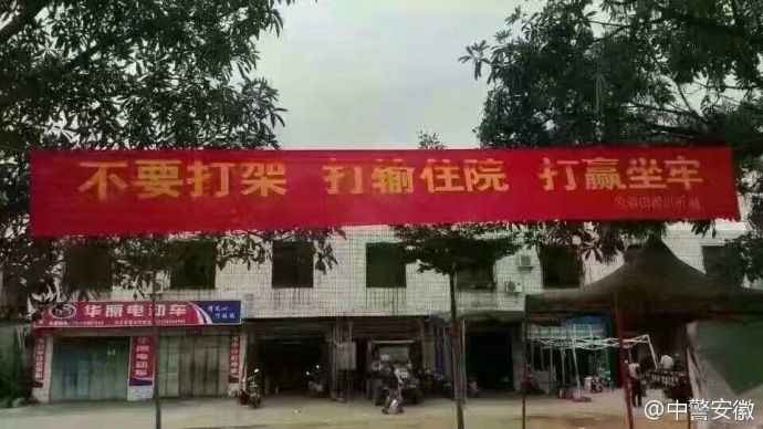 据悉,这条横幅是海南白沙县公安局挂出来的,因年前发生一起打架事件,打输的那位住院了,打赢的被抓了。挂出这条横幅后,“春节期间一起打架斗殴的事件也没发生”。