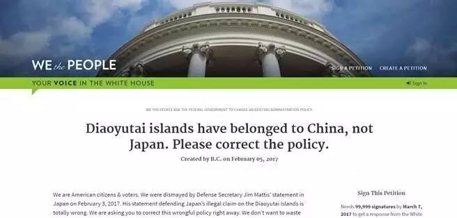 张昭富向白宫请愿的申请上提出,“钓鱼岛是属于中国的,并非日本。请纠正政策。”