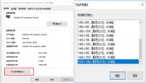 在“适配器”一栏中打开“列出所有模式”,并选出适合电脑的模式。(通常情况1440*900到1920*1080就可以满足绝大部分电脑)