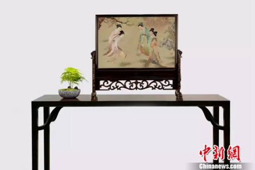 大德祥出品的霸王枨条案与姚建萍刺绣艺术馆的《仕女蹴鞠图》