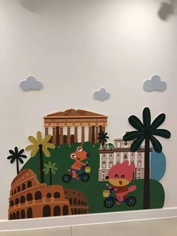 进入园所的中厅和连廊,首先就会被鲜明的IP形象所吸引,听园长说这些形象都是青苗荟总部自有的IP形象,它们都有自己的名字、年龄、性格特点,小朋友们非常喜欢。