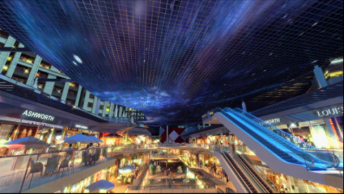 在外部商圈,多样化的业态组合通过空间设计,找到恰到好处的位置。娱乐和美食的搭配,在共享空间当中,多种业态相互促进,互相吸引。像健身中心、影院、水吧、KFC、冰场、酒吧、美食广场、LED屏视频舞台、卡丁车场、攀岩墙,人们休憩的红色玻璃台阶,儿童玩耍的音乐喷泉这些场所。尤其是空中广场的设计,在吸引消费人流的同时更为大家构建了享受现代生活的新去处。