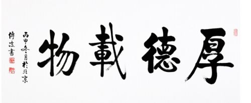 我们所有的财富、智慧,我们的一切,老祖宗用一个字来代表叫物。厚德才能承载万物。清华大学的校铭“厚德载物”。四字书法“厚德载物”寓意美好,积极向上,在我们日常生活中,更是很多场合的必备书法装饰画,比如在家中客厅、书房、卧室、餐厅等地悬挂厚德载物书法有自勉激励的作用;在学校教室、校长办公室、教授办公室等场合悬挂厚德载物书法体现教师及校长的美好品质;在公司办公室、会议室悬挂厚德载物书法,可彰显领导的修养风范等等。