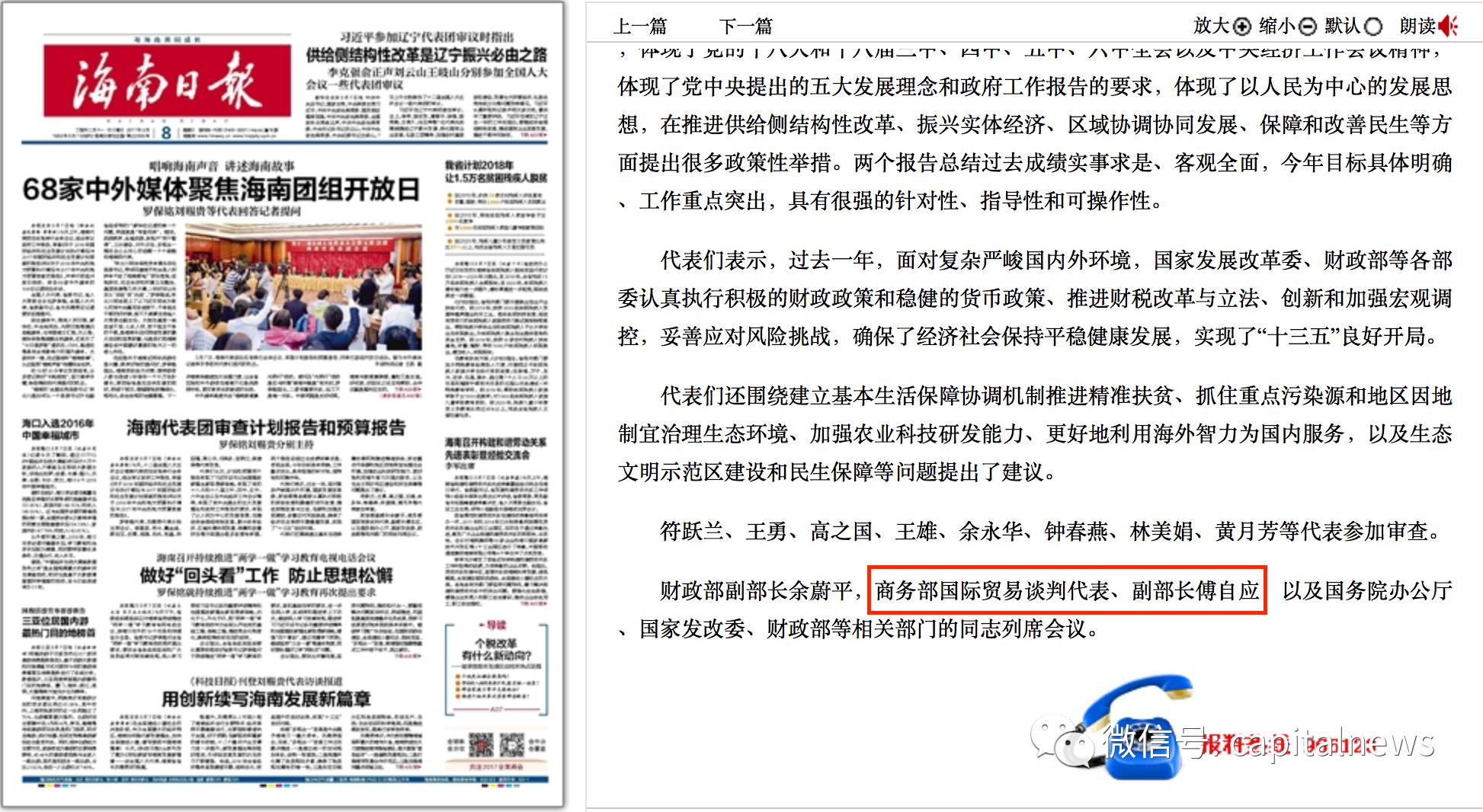 今天的海南日报显示,中纪委驻中宣部纪检组组长傅自应,已出任商务部国际贸易谈判代表、副部长。