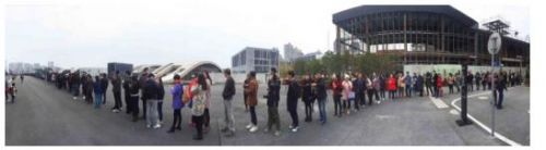 齐鲁晚报03月13日讯:早已和朋友约好,趁着《双年展》最后2天(2017年3月11日-12日),赶紧去体验一下大师们的杰作,上午11点开馆前我们已到达上海当代艺术博物馆。可眼前的一幕,让我和小伙伴们惊呆了,这是春运的节奏吗?这个队伍足足有500多米都不止……但都已经来了,这个决心很坚定!看来大家都是赶在最后2天来体验《双年展》的。