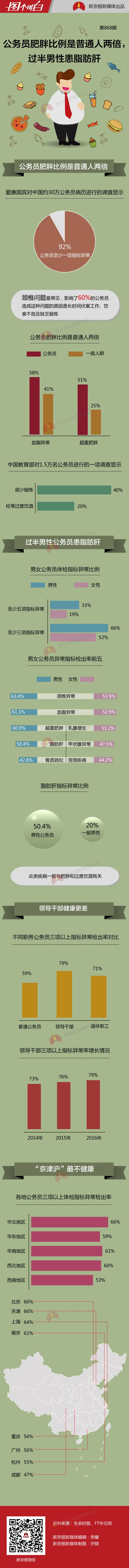 原标题:公务员肥胖比例是普通人两倍,过半男性患脂肪肝一项调查显示,中国公务员并没有一般人健康。近日,爱康国宾对30万份公务员常规体检结果的分析调查发现,在16类健康指标中,92%的公务员样本人群至少一