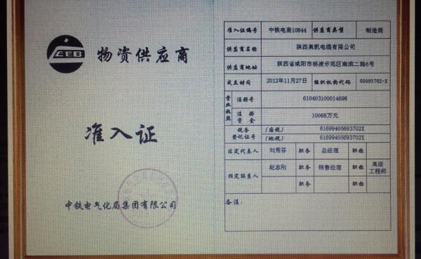 该公司官网显示,该公司还持有中铁电气化局集团有限公司物资供应商准入证,该证书内容显示,持有该证书的单位,可以参加铁路大中型建设项目电力工程电线、电缆等物资设备投标。奥凯电缆公司所持该证书的有效期为2013年5月14日至2017年5月13日。