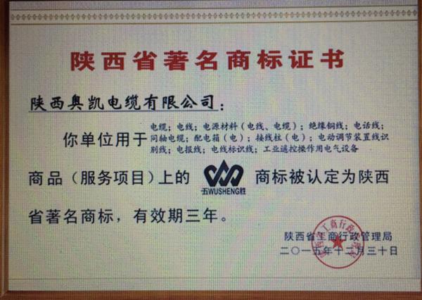 2014年12月28日,该公司在国家工商总局商标局注册了“万胜”商标。2015年12月30日,奥凯电缆公司所拥有的“万胜”商标,被陕西省工商局认定为“陕西省著名商标”,有效期为三年。