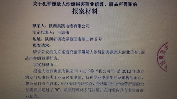 奥凯电缆公司官网公布的报案材料