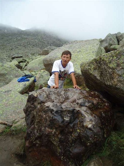 朱曼的大儿子肯杰别克·热阿玛扎恩与陨石的合照。