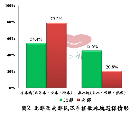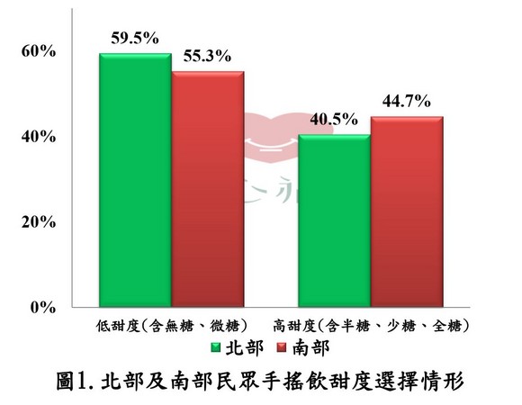台北市卫生局食品药物管理处处长王明理表示,经统计发现,北部消费者选择无糖、微糖比率为59.5%,高于南部55.3%,选择半糖、少糖、全糖的南部消费者占44.7%,高于北部40.5%。此外,南部消费者手摇饮含冰块比率79.2%,高出北部54.4%,显示北部民众喜欢低甜度手摇饮品,南部则爱添加冰块。