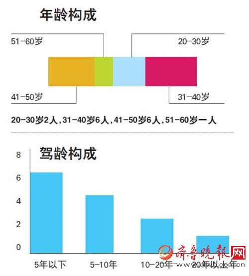 5年以下驾龄(含5年)7人,6-10年驾龄(含10年)4人,11-20年驾龄(含20年)3人,20年以上驾龄1人