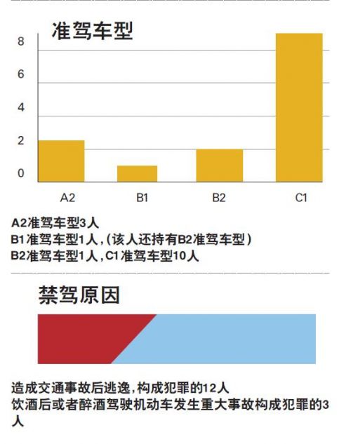 从禁驾人员持有的驾照类型看,持有C1驾照的私家车驾驶人依旧占多数,有10人。此外,也有5人持有AB类驾照,属于职业驾驶人,占到总数的33 . 3%。对于这些职业驾驶人来说,此次被禁驾也宣告了他们职业生涯的终结,捧在手里的饭碗也因此被摔在了地上再也无法捡起。