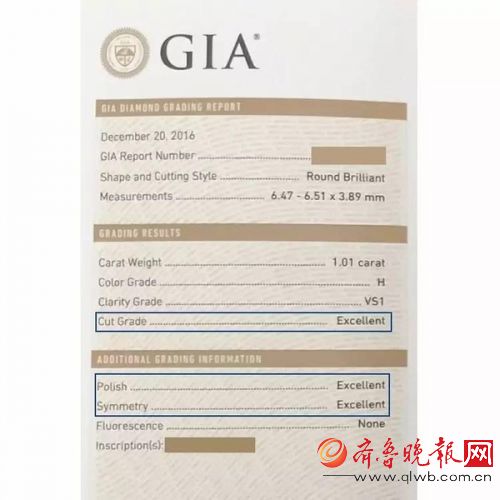 钻石的切工、抛光、对称、光泽及比率均达到最佳级别,