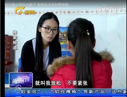 电视画面中,佳佳回忆,张校长的休息室里有几张床。她说:“我们坐在床那里,他跟我说,我的脚还疼不,我说不疼了,那天我和同学玩不小心弄到脚,他说他会法术,传授给我,然后他就去门口那里东看西看,把门锁起来,叫我站起来,就叫我放松,不要紧张,就把我裤子给脱出来,就叫我转头过来,不要动,不要紧张,放松,还叫我不要睁开眼,然后我睁开了一点,看到他拿了手机来拍照,他拍完照了就把我抱到床上。”