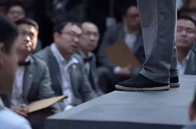 马校长迟到了10多分钟,随后脱掉了上午穿的西装外套、皮鞋,身着红色毛衣、黑布鞋登台。