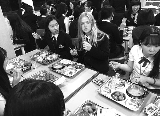 莎拉·詹金斯和韩国同学们在食堂用餐。